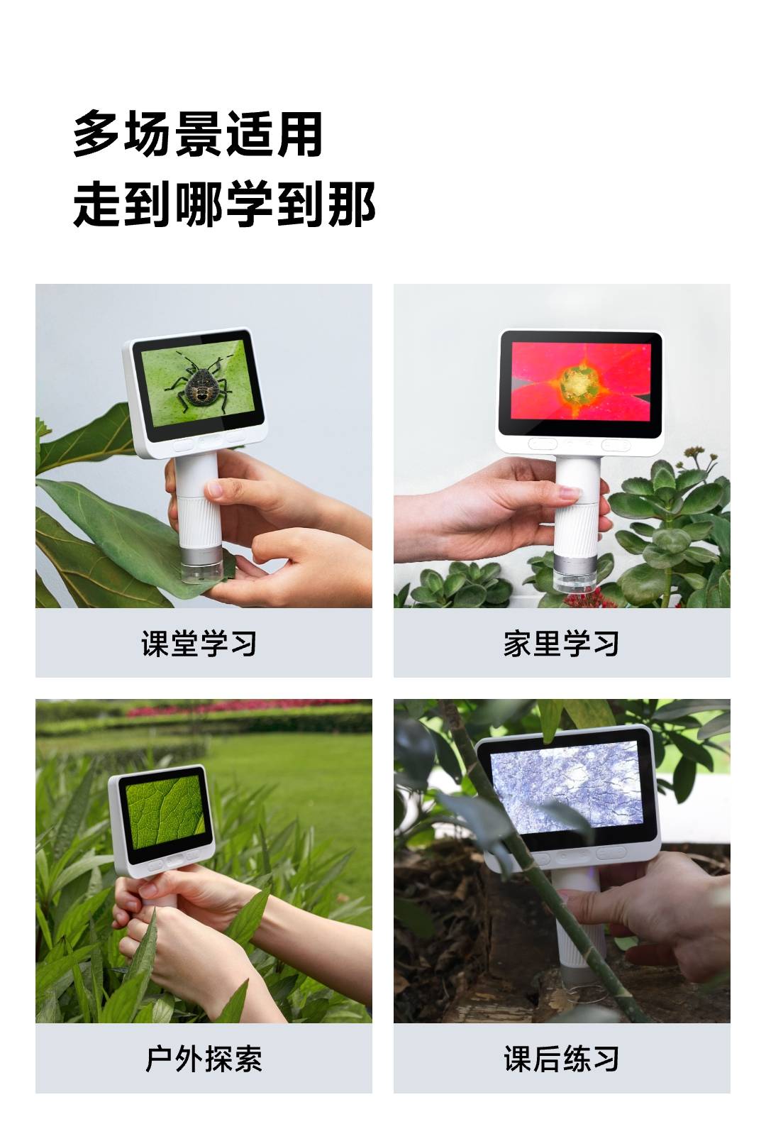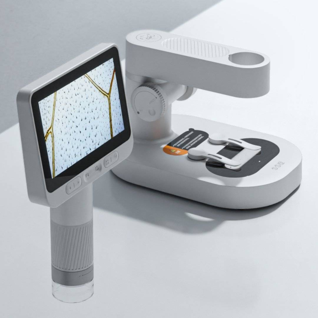 双模式设计:手持便携+立式专业双模式,手持显微镜仅重约100g,户外探索无负担,室内户外皆可用。
