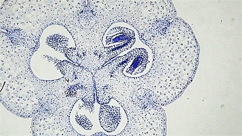 再来观察一下百合子房切片标本,背缝线、子房室、胚珠、腹缝线、胎座、子房壁等清晰可见。
