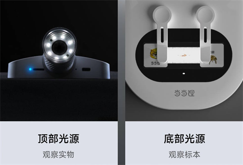 底座配置了上下明暗光源和7种智能染色光源,无需额外补光,也不用碘酒染色,化繁为简,轻轻松松就能体验专业科学实验的乐趣。