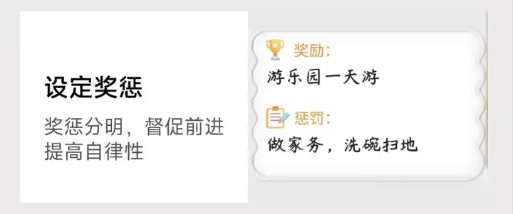 这种奖惩方式会让孩子产生满足感和成就感,激发孩子主动规划时间的意愿,激励孩子慢慢坚持下去,从而养成习惯。