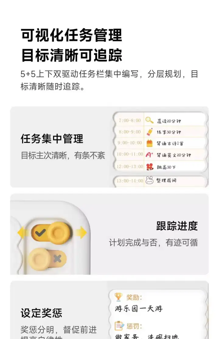区别于市面上其他时间管理器,当当狸时间管理器是具备可视化任务管理,还能按钮拨动打卡,可培养自律习惯,提高孩子的学习效率。