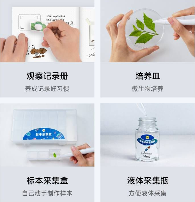 原创微观科普书籍、观察记录册、生物载玻片、标本采集盒、培养皿、采集瓶等,仪式感满满,轻轻松松化身小小科学家。